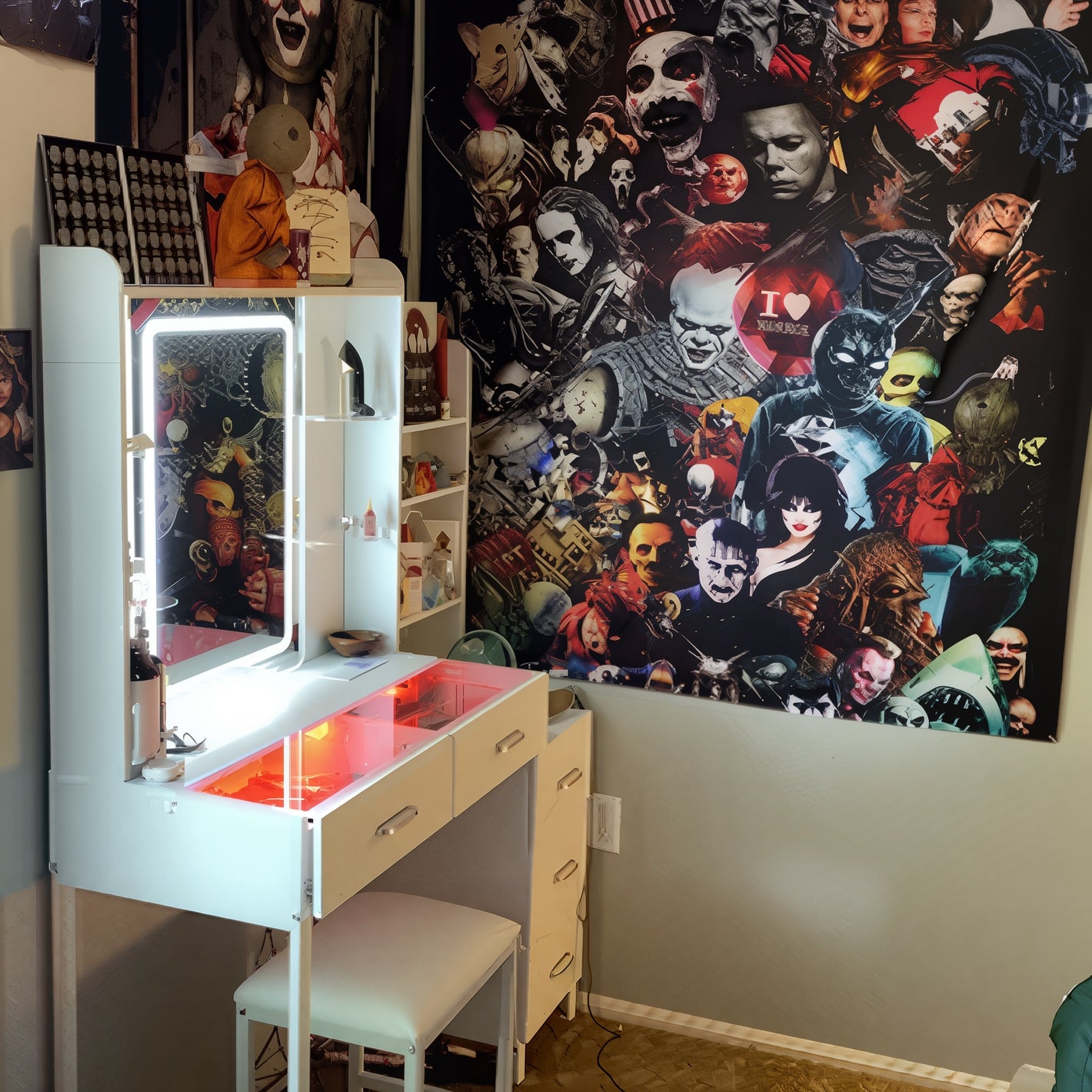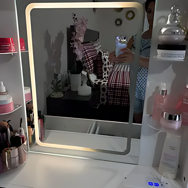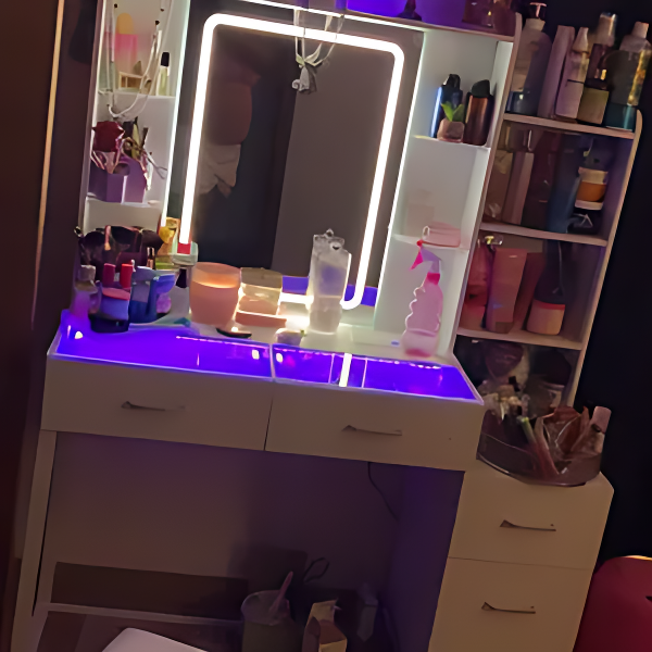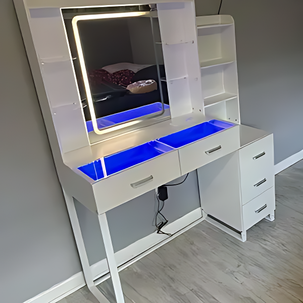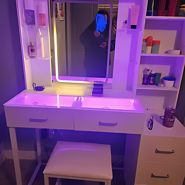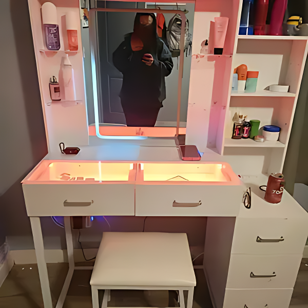 This vanity features adjustable LED lighting, a wireless charging pad, customizable RGB drawer lights, and a sleek glass top. It also includes a built-in power outlet and safety switch for added convenience and security.