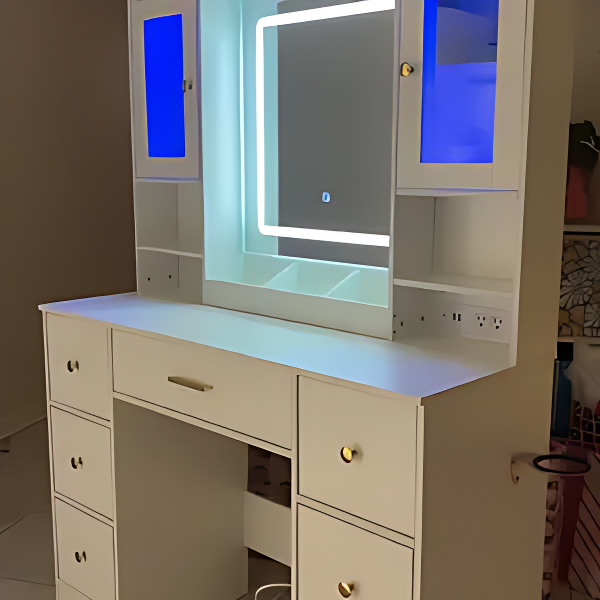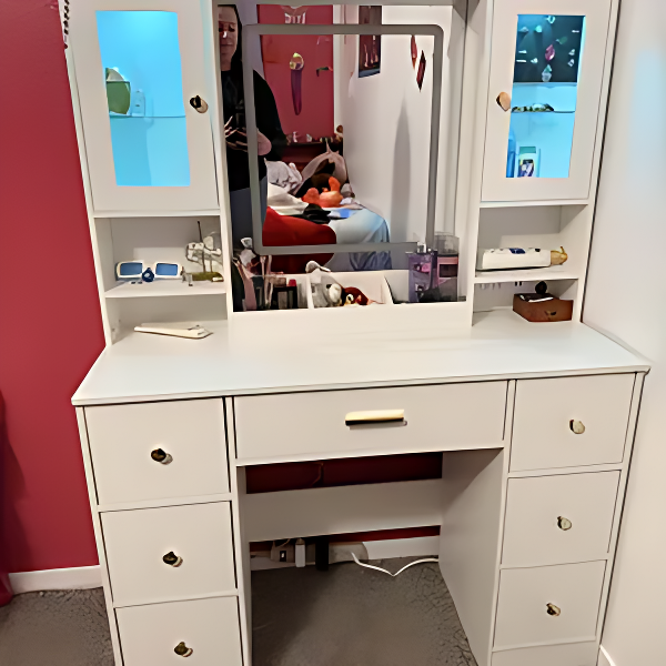 The vanity comes with 7 spacious drawers, providing plenty of storage space for your makeup, jewelry, and other accessories. It also includes a dedicated jewelry cabinet with small compartments.