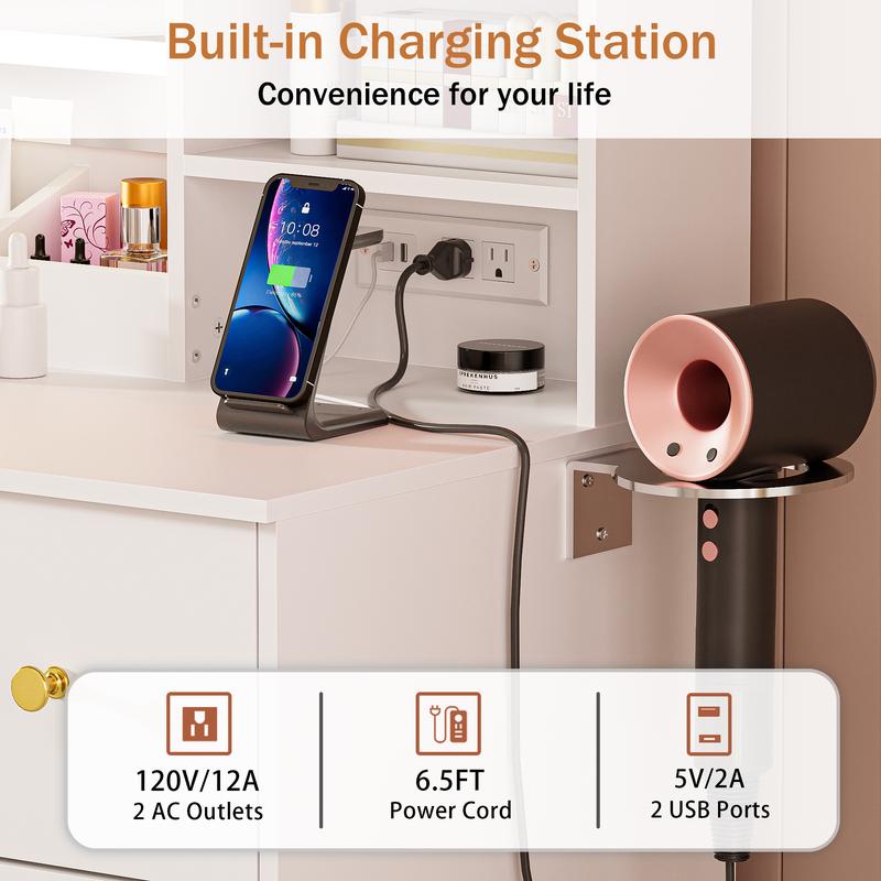 Yes, the vanity includes a built-in charging station with USB ports, so you can charge your phone or other devices while getting ready, keeping your space neat and organized.