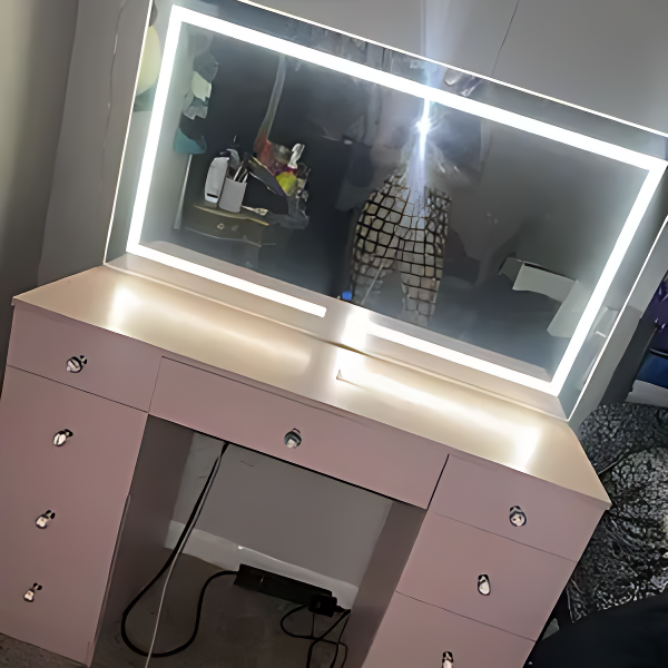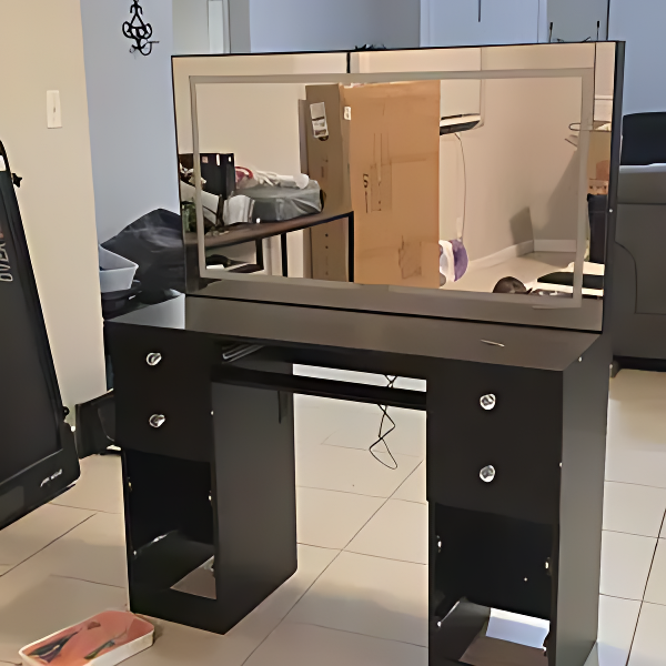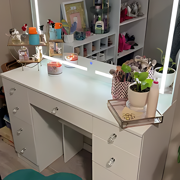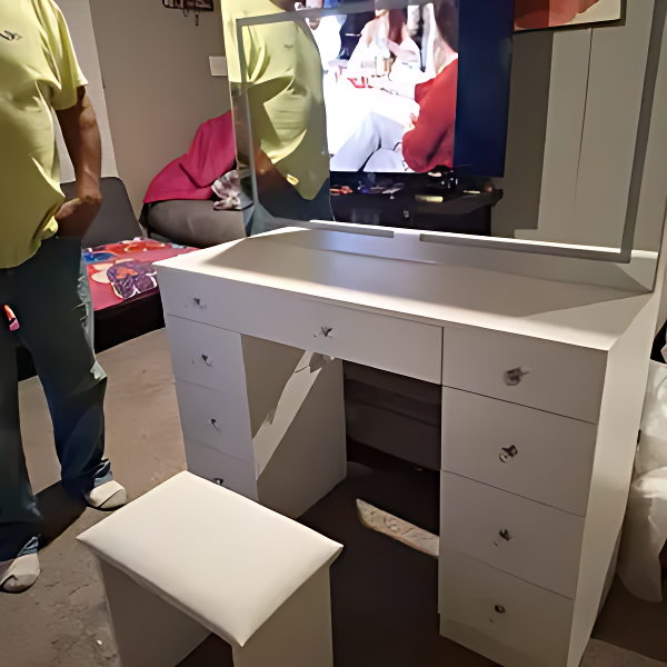 Our vanity desk is crafted from high-quality engineered wood with a durable laminate finish, ensuring long-lasting use and an elegant look. The stool features a soft, cushioned fabric for maximum comfort.