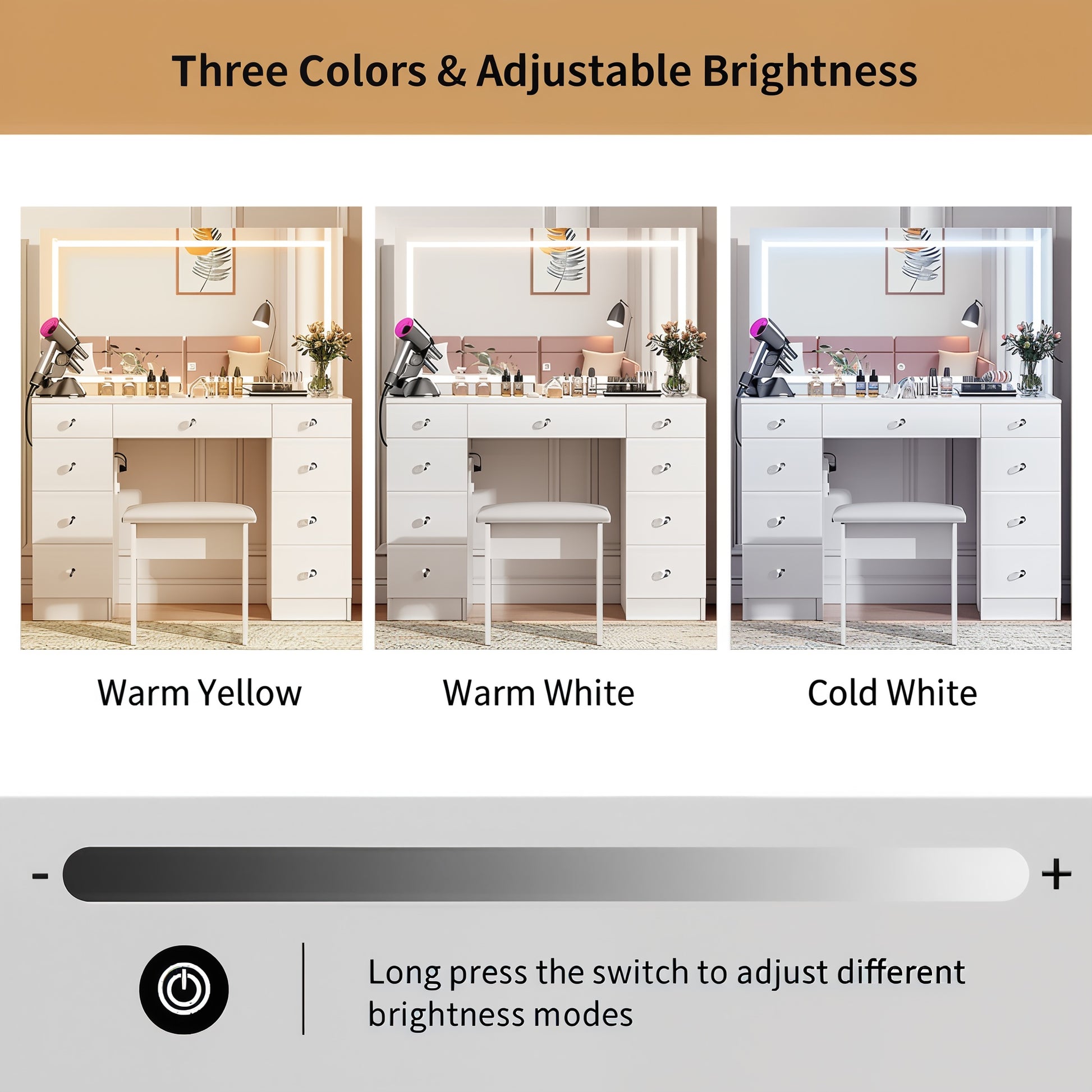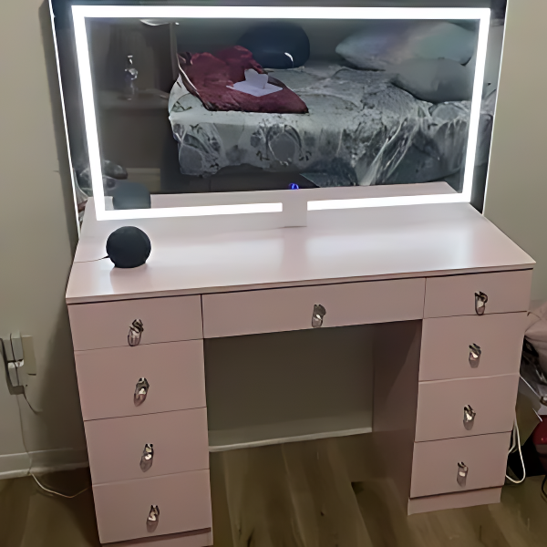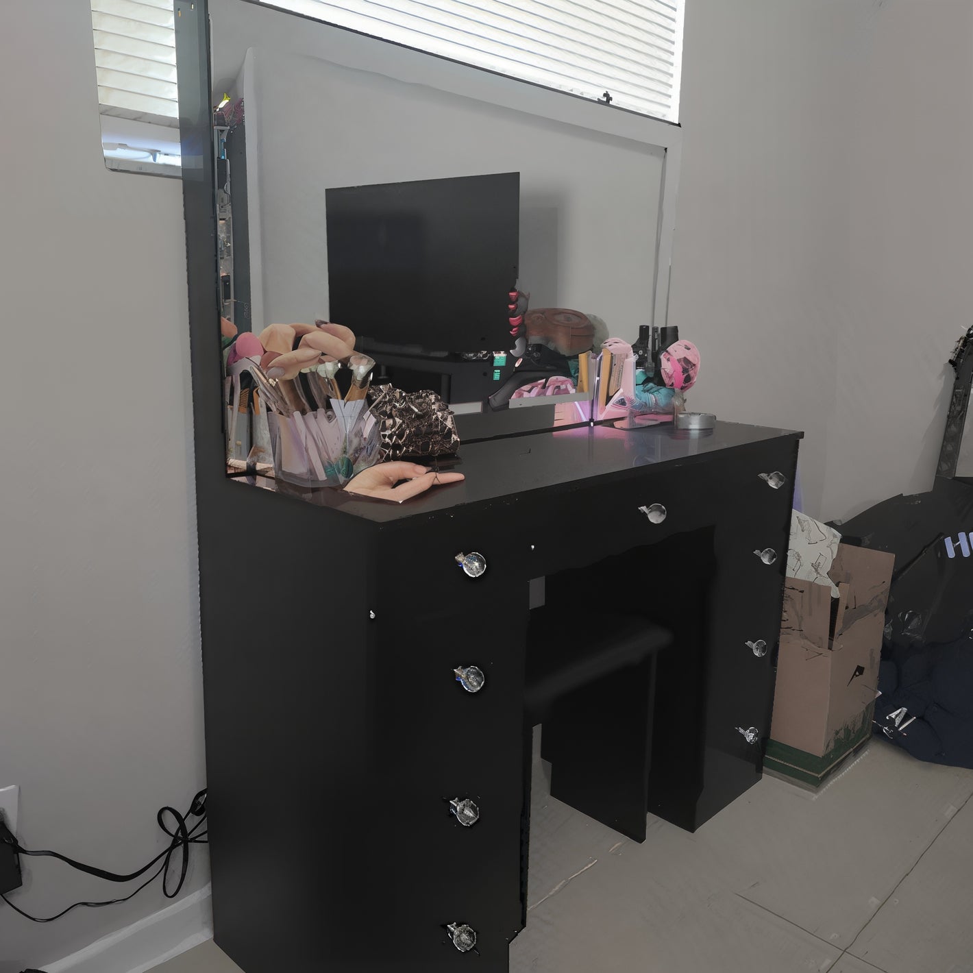 The vanity desk can support up to 100 lbs, and the stool has a weight capacity of 250 lbs, making it both sturdy and comfortable for long beauty routines.